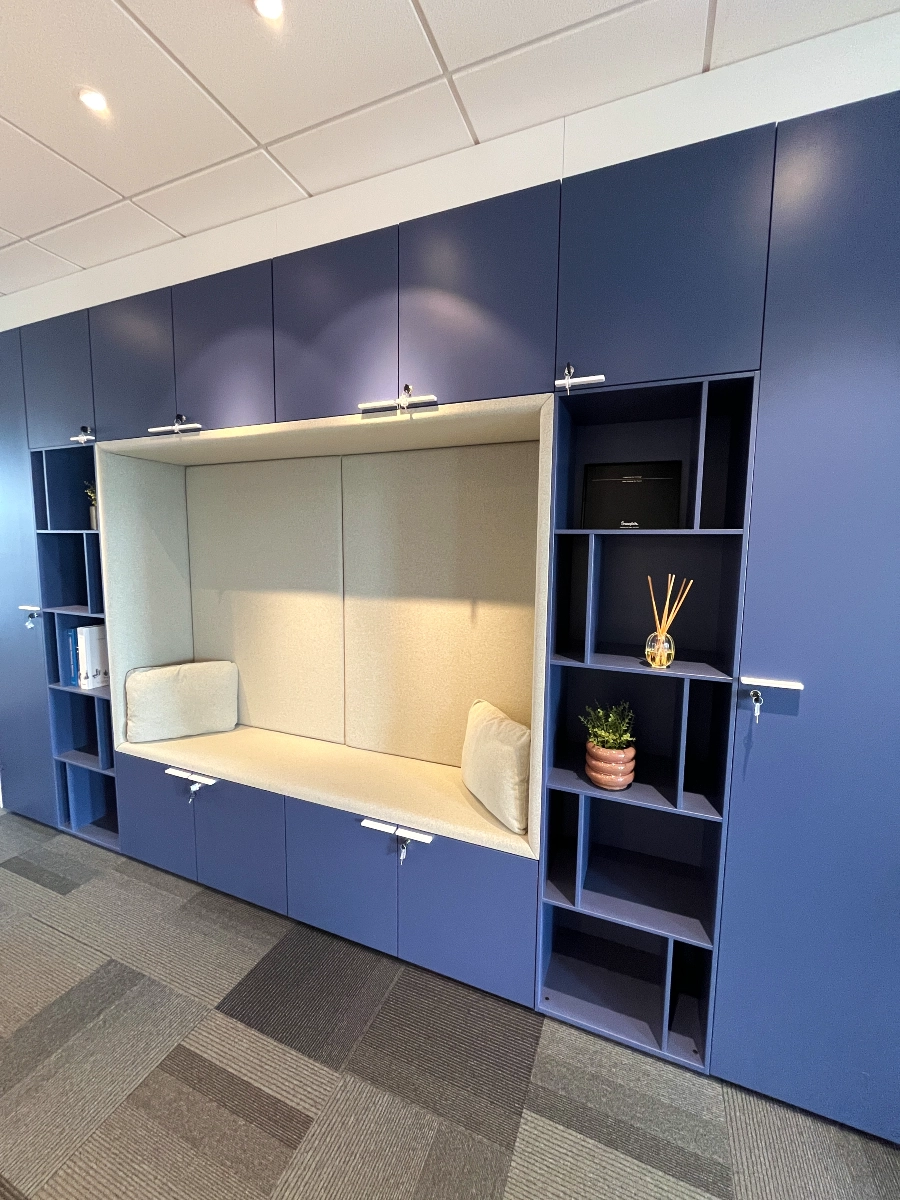 Projet d’aménagement global en démarche ABW, intégration de panneaux acoustiques dans les espaces de travail en open space, fourniture de bureaux levés-baissés, équipement de fauteuils de travail ergonomiques. Deux salles de réunion ont été gérées avec des tables hautes et des tabourets en tissus colorés. L’espace nomade et flex office sont pensés dans un environnement de travail collaboratif et engageant. L’entrée conviviale a été traité autour des valeurs communiquer, se rencontrer et accueillir. La grande salle de réunion est mobile, les tables sont rabattables et sur roulettes, les plateaux sont équipés de prises électriques/USB. Chaque espace a été pensé en fonction des usages.